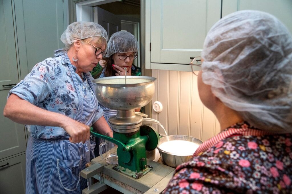 Vanhan ajan separaattori hyrrää. Erottunut kerma vatkataan kotivoiksi ja kurrista tehdään piimää. Täysmaidosta saadaan ihanaa kotijuustoa. Näin kulkee kurssipäivä Karjaisten tilalla.