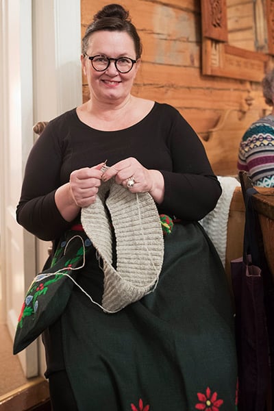 ”Västäräkki ei ole koriste. Se ei ole yhtä tiivis kuin normaali neljä oikein, yksi nurin -neulos, vaan se päästää kovalla pakkasella ruumiinlämmön lävitseen. Tämä höyry lämmitti sitten hevosmiesten kasvoja, kun he ajoivat kovalla pakkasella heiniä tai puita tai olivat kalassa hyytävällä meren jäällä”, Eila selittää.