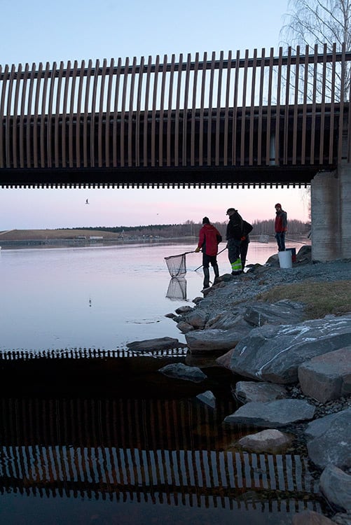 Lippokunta sillan alta lähtee kotiin, mutta alajuoksulle tulee toinen seurue. Edellisinä iltoina lippoajia on seisoksinut rannoilla kymmenittäin, mutta nyt sunnuntaina on rauhallisempaa.