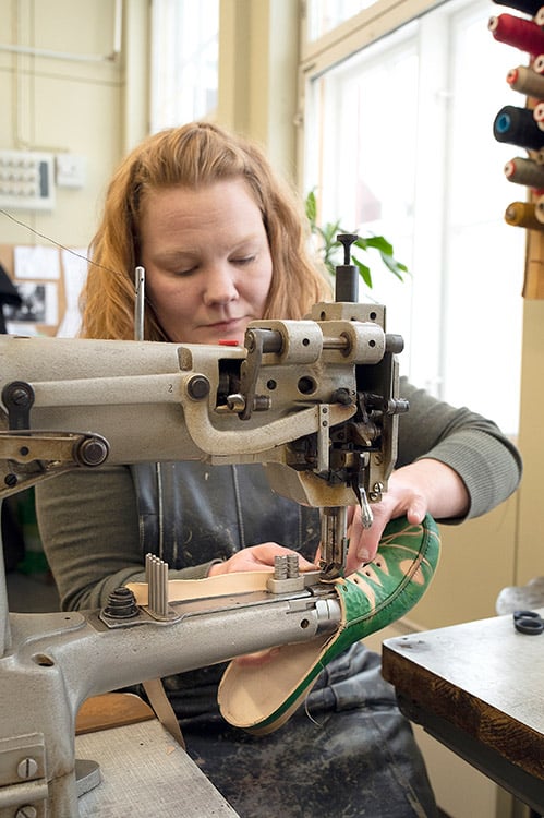 Naskali lävistää nahkaa. Pikitikin suutari Hanna Piipponen nappaa pikilangan päät suustaan ja tuikkaa ne reikäparin läpi. Pitävä solmu syntyy yhdellä nopsalla kiepautuksella. Tumma sauma etenee nahan reunassa kuin metsämyyrän jälkijono hangella.