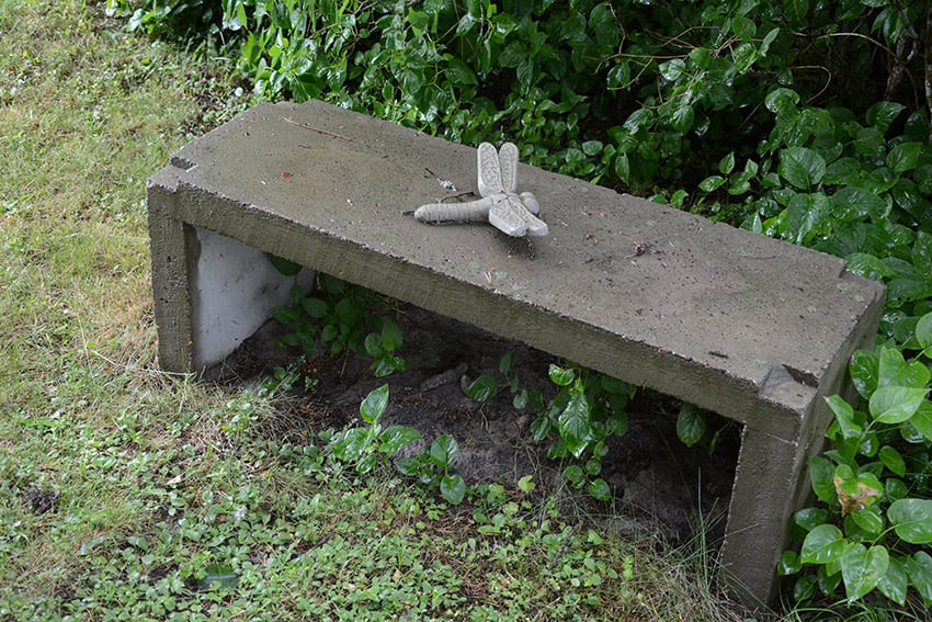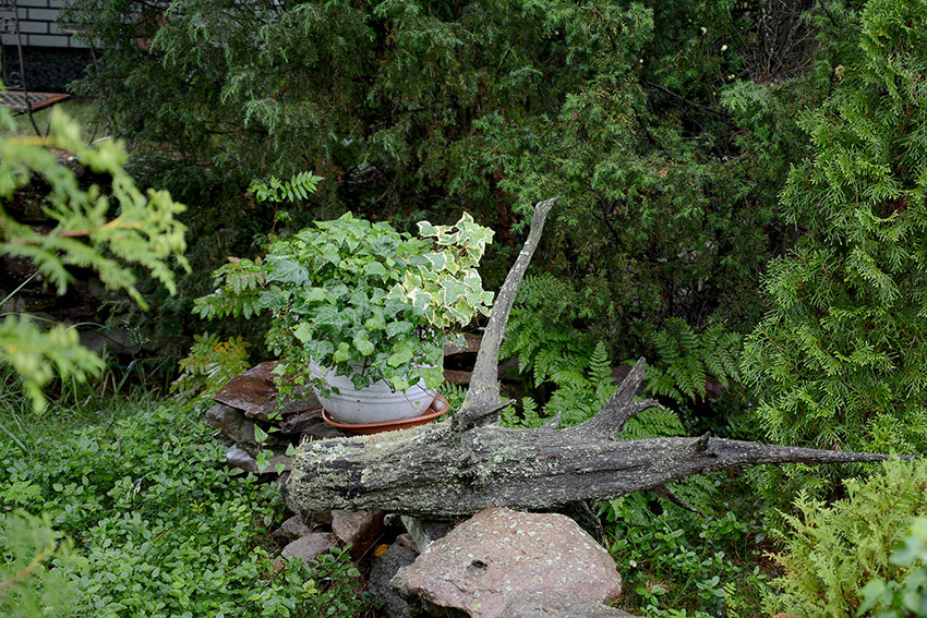 Ilkka on työstänyt puutarhassa monia materiaaleja. Aasialaiseen puutarhaan syntyi betonista penkki ja perhonen sen päälle.