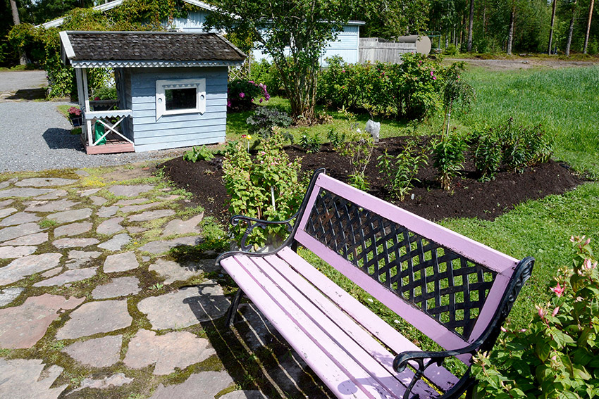 Maaleilla saa väriä maisemaan myös silloin, kun kasvillisuus ei kukoista. Roosaksi maalatun penkin vieressä on isännän ikioma, uusi istutusalue. Vaaleansinisen pikkumökin Ilkka rakensi aikanaan keppihevostalliksi lastenlapsille.