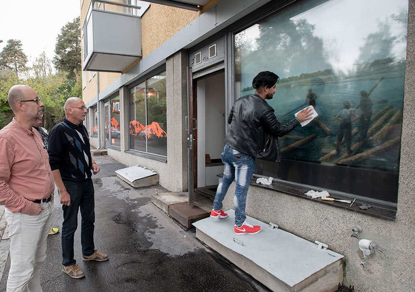 Iltapäivä alkaa olla lopuillaan. Vielä on yksi tehtävä ennen kotiin lähtöä. On aika kiinnittää Tukkimiehet ikkunaan ohikulkijoiden silmäniloksi sekä vinkiksi juttuseuraa ja yhteistä tekemistä kaipaaville miehille.