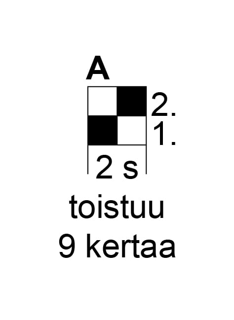 3. krs: Neulo kuten 2. krs. Pidä langat edessä koko kerroksen ajan, mutta ota langat työhön päinvastoin: *Ota valkoinen lanka työhön harmaan alta ja neulo sillä 1 n, ota harmaa lanka työhön valkoisen alta ja neulo sillä 1 n*, toista *-* krs loppuun. Katso opasvideo hakusanalla ”latvialainen palmikko”.