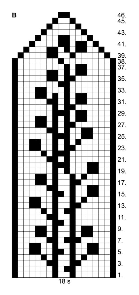 Tee oikean käden lapanen samoin, mutta neulo puikoilla 3. ja 4. ruutupiirroksen A mukaan ja puikoilla 1. ja 2. piirroksen B mukaan. Tee peukalonaukko 3. puikon alkuun.