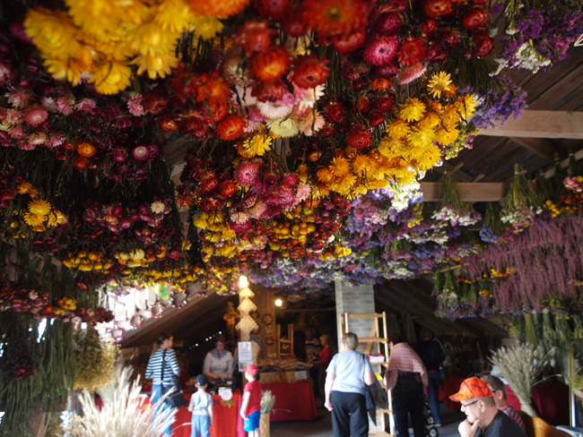 Kukkataivas avautuu myös vanhan navetan vintillä: katto on täynnä kuivuvia kimppuja. ”Espanjassa katosta roikkuu kinkkuja, mutta en tiedä, onko missään muualla tällaista tilataideteosta. Joillekin se on tärkeämpi kuin kukkapelto”, Halonen myhäilee.
