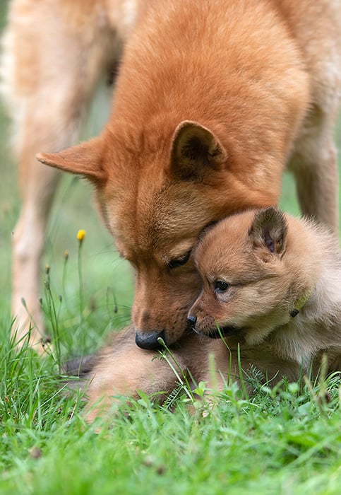 Lumi pöllyää ja keltainen, sioille tarkoitettu stressipallo lentää korkealle, kun suomenpystykorvat Hippa ja Pörri pelaavat isoapalloa. Teini-ikäinen Kekri seuraa sivusta, mutta ei vielä tohdi osallistua.